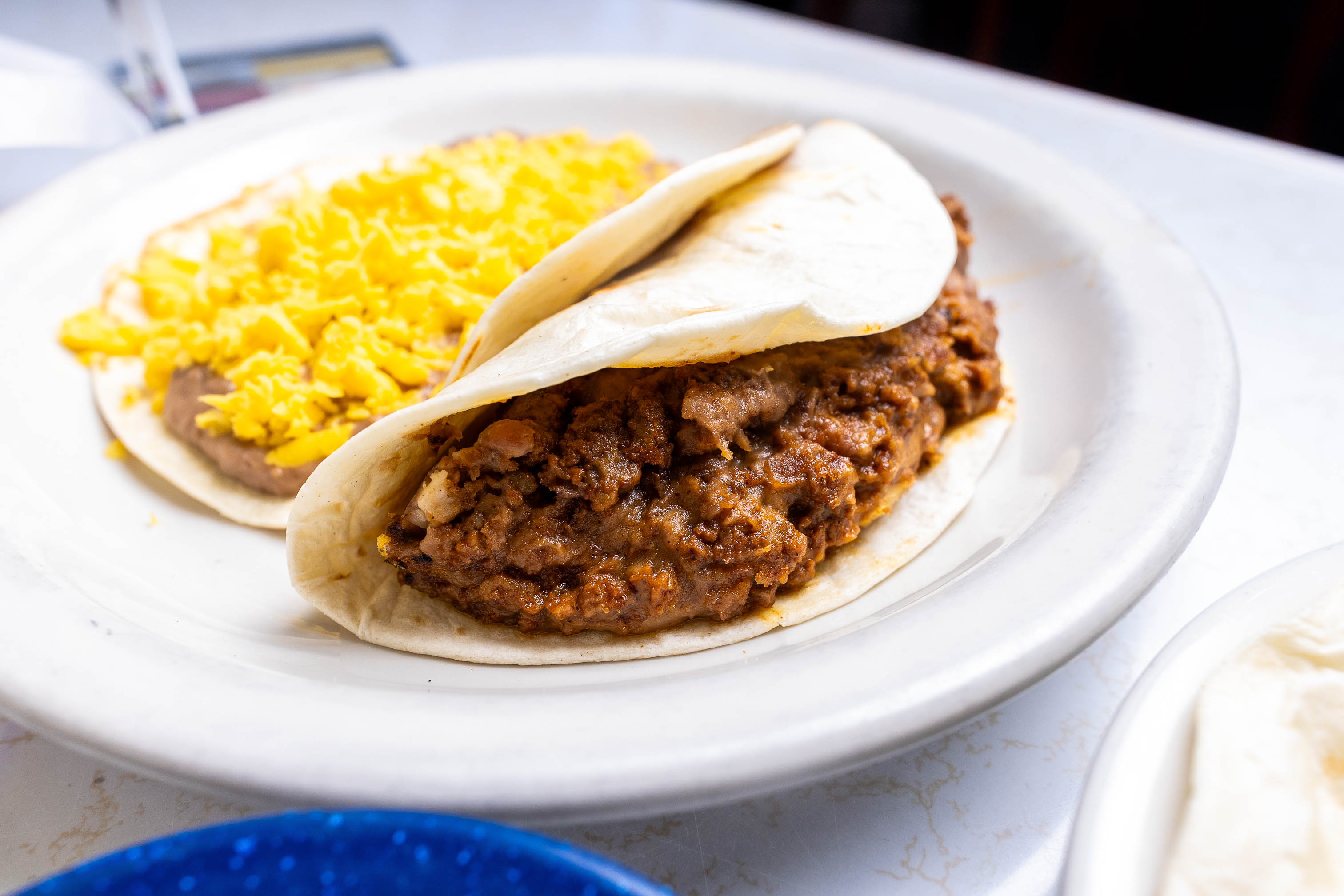 Two beef or cheese enchiladas served with charro beans, rice, salad and three corn tortillas