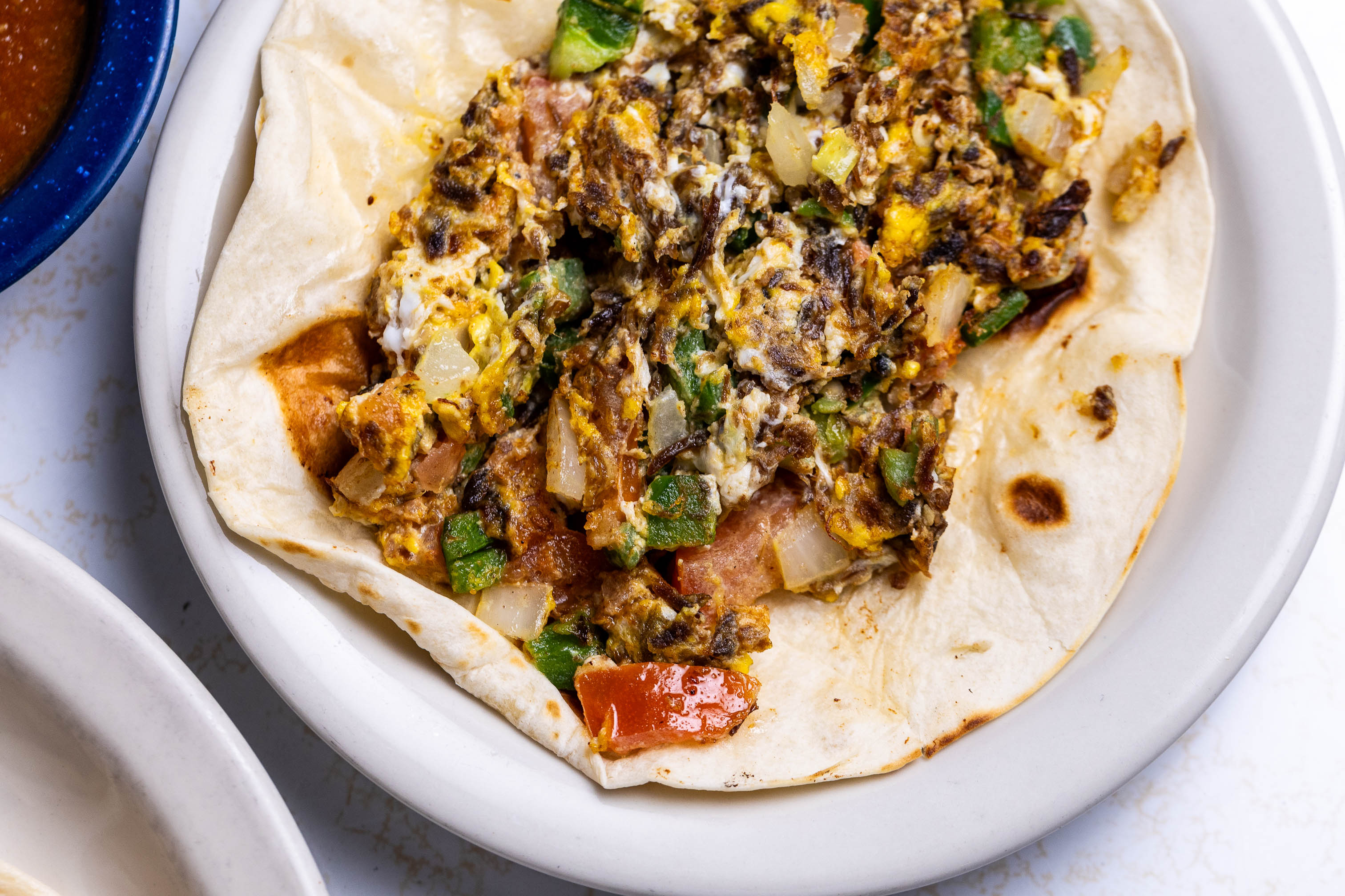 "A secret combination of potatoes, eggs, bacon, and shredded cheese served in a deliciously hot flour tortilla